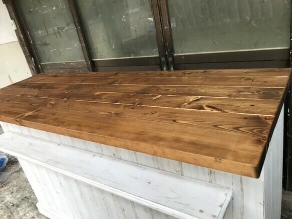 ■無垢板を使い天然の風合いを生かしたカウンターテーブルです。デザインは縦のラインでシンプルですがホワイトシャビーに仕上げてアンティーク感を演出しています。