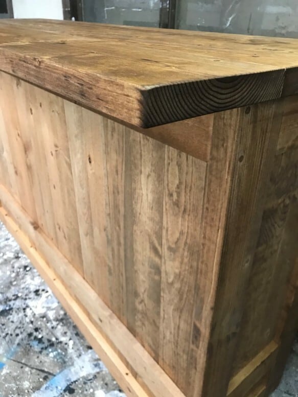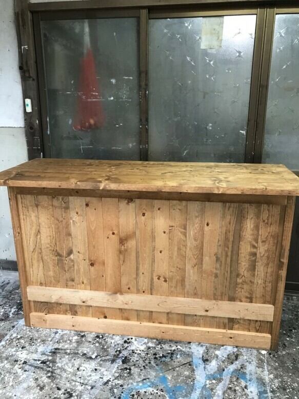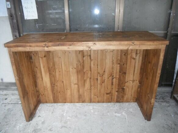 ■無垢板を使い天然の風合いを生かしたカントリーなバーカウンターテーブルです。塗装はワトコオイル;ミデイアムウォルナット(ツヤ消し)でナチュラルアンティークな感じに仕上げています。